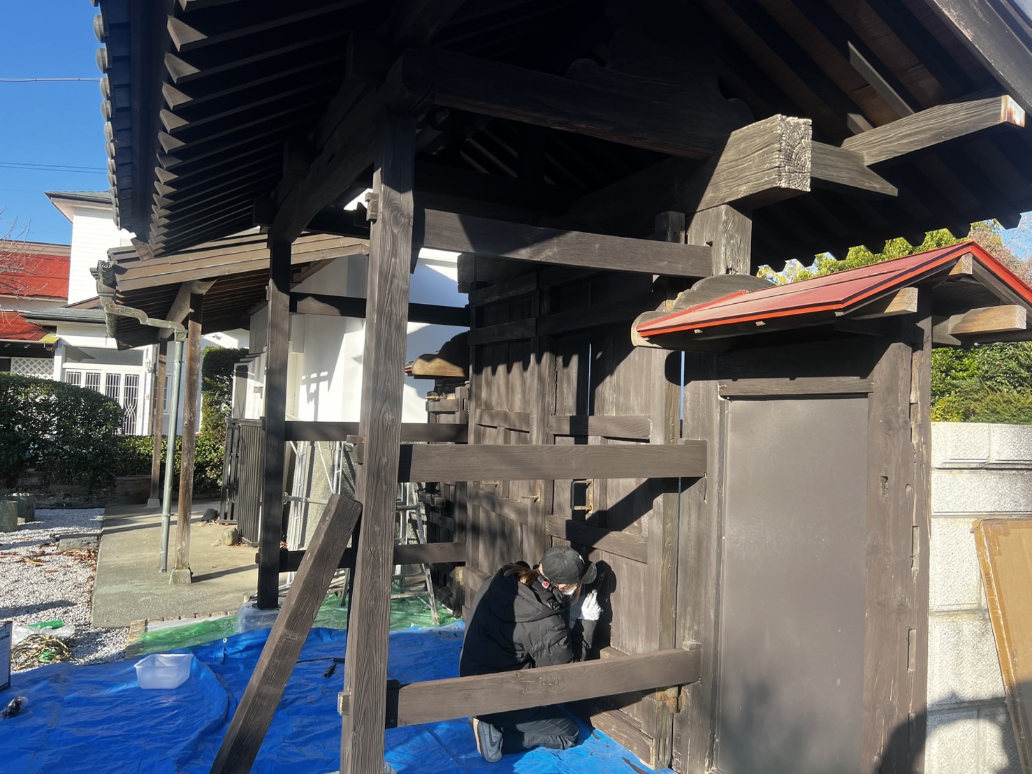 相模原市南区磯部にある一般住宅の入口に構えられた薬医門の塗装工事に、本日より着工しております。