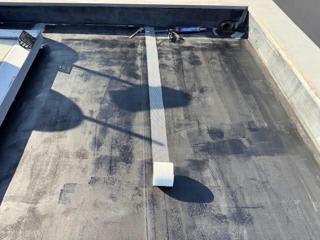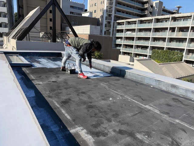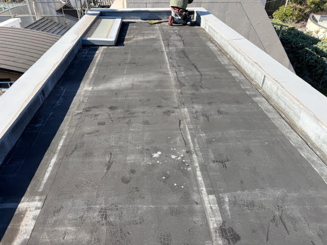 防水の上を歩くと靴の裏が真っ黒になってしまう状況です。これ以上、放置してしまうと防水を剥がさないと工事を進める事が出来ないため、費用面を考えると今回工事をされて良かったと思います。