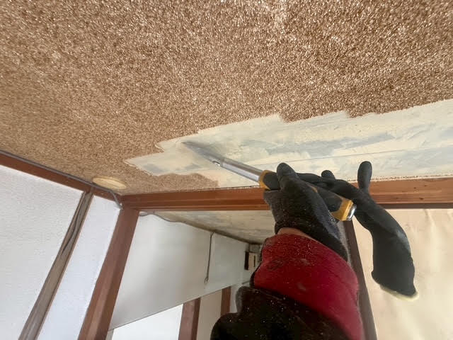 除去せずに吹付作業を行ってしまうと弱くなっている建材の上に吹き付けるわけですから、触れば落ちてきます。