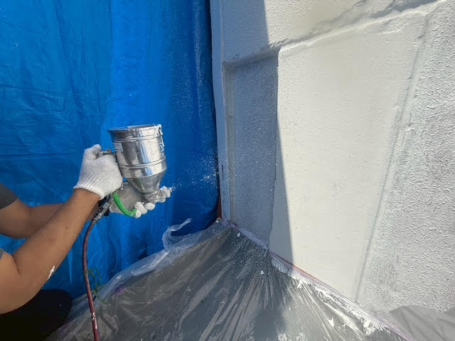 また、吹付によるパターン出しもあるので隣接する住宅にご迷惑を掛けないよう、こちらもしっかり養生を行ってからの作業となりました。