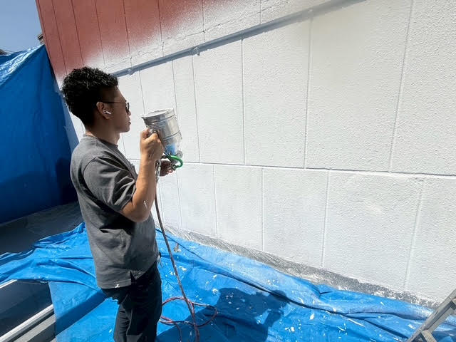 一旦、パターンを付ける為に白色に吹き付けます。この際、白は太陽が反射してしまい見えづらくなってしまう為に、サングラスを掛けてしっかり確認を行いながらの吹付作業となります。